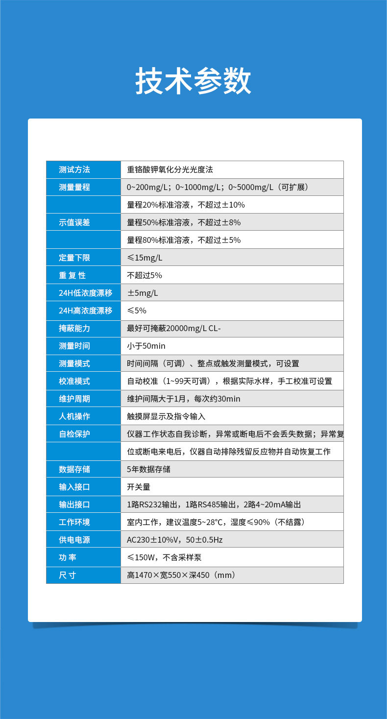 測量周期 | 較小測試周期20min,根據實際水樣,消解時間5~120min可設置 |